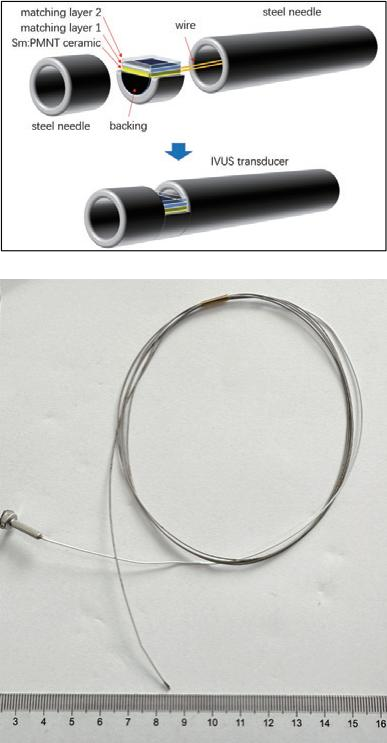 30MHz血管内超声探头是一种微型化介入诊断设备,通过导管将高频超声换能器送入血管腔内,生成360°横截面实时图像,用于精准评估血管壁结构、斑块性质及支架植入效果。其核心价值在于突破传统冠脉造影的局限,为复杂心血管介入手术提供“毫米级导航”。本公司所开发的IVUS30微型高频换能器,采用基于模板法的1-3型压电复合材料,高密度PZT陶瓷微柱阵列(≤40μm宽度),抑制横向模态耦合,在30MHz超高频率下实现轴向分辨率≤60μm,可穿透血管壁深度≥15mm。并结合多层宽带透声窗技术,-6dB带宽≥85%。探头直径≤1.1mm(5F导管兼容),搭载64阵元环形相控阵,支持360°全景成像与实时斑块成分分析(VH-IVUS),动态范围>100dB,适配3.0mm内径冠状动脉及外周血管介入诊断。